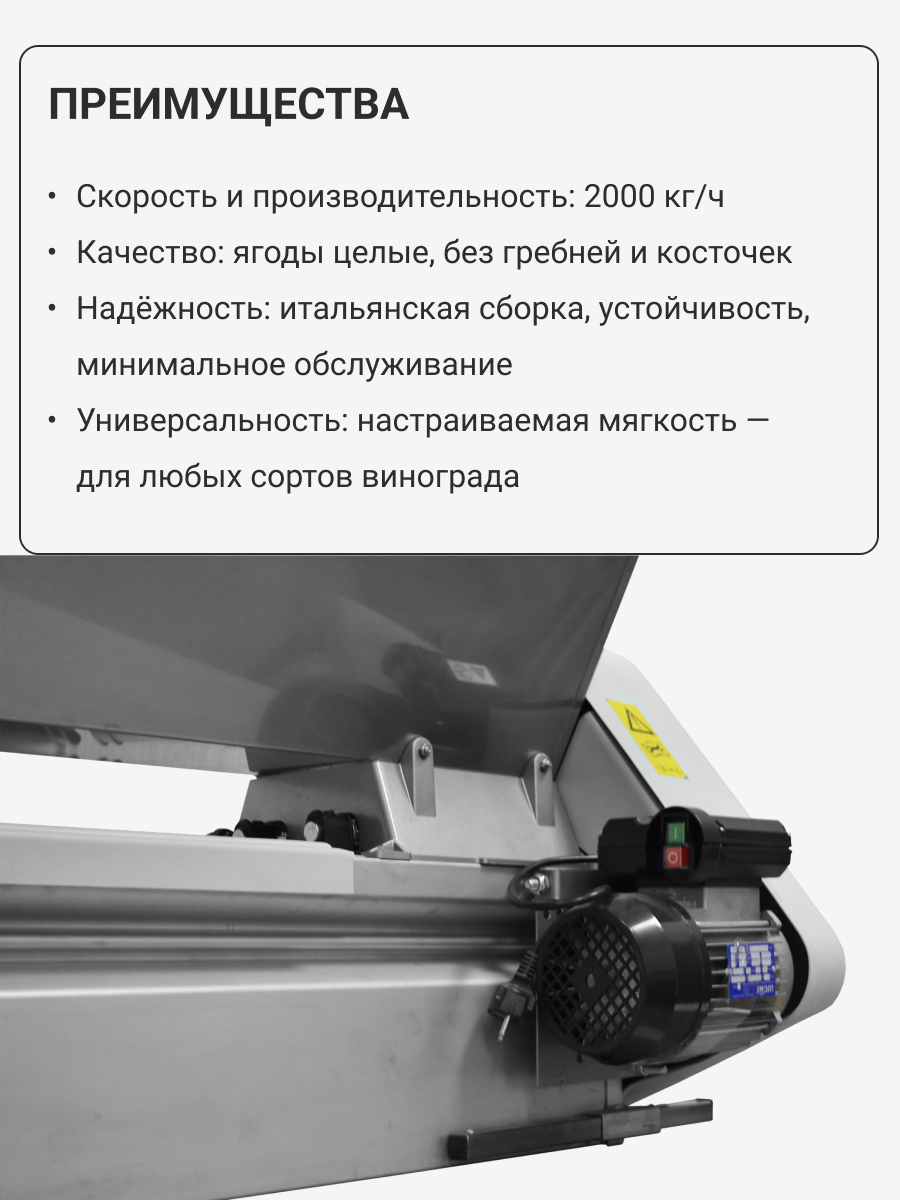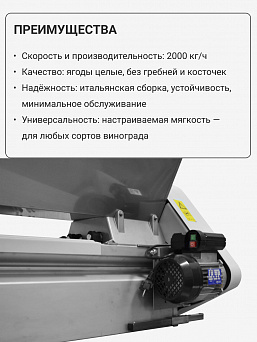 - Регулировка по мягкости дробления, что позволяет учитывать нюансы получения мезги из винограда разных сортов и размеров.